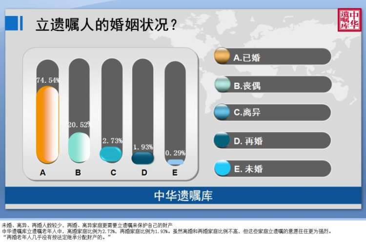 中华遗嘱库立遗嘱老年人中,离婚家庭比例为2.73%,再婚家庭比例为 1.93%。虽然离婚和再婚家庭比例不高,但这些家庭立遗嘱的意愿往往更为强烈。
