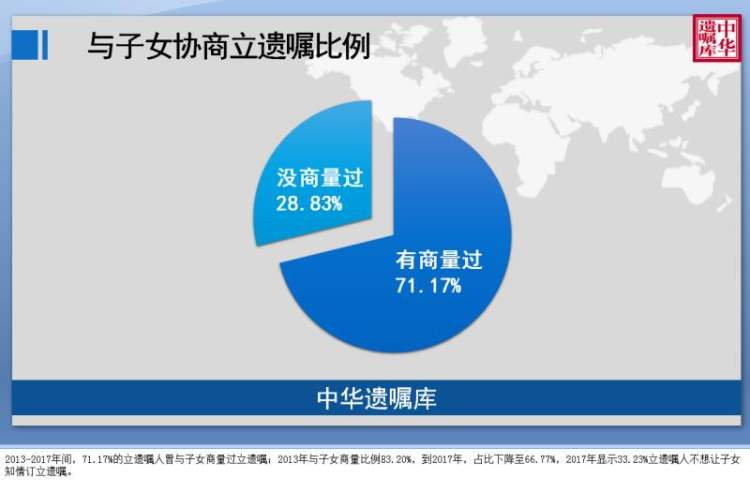 中华遗嘱库数据显示,66.59%的老年人是子女陪同下前来办理遗嘱登记,33.41%的老年人是瞒着子女前来办理,而且瞒着子女的比例从2013年的 21.28%到2017年的38.31 %有逐步走高的趋势。71.17%老年人在订立遗嘱前会与子女协商,28.83 %老年人选择向子女隐瞒立遗嘱的事情。在未隐瞒立遗嘱的老年人中,有33.4%选择隐瞒分配方案。