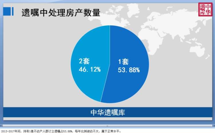 数据显示,房产仍然是老年人家庭财产的主要组成部分。在中华遗嘱库所登记的遗嘱中,处理房产的比例占到99.69 %,其次是银行存款17.66 %,公司股权 2.12%。这充分说明,目前人们订立遗嘱仍然以处理不动产的继承为主要目的。