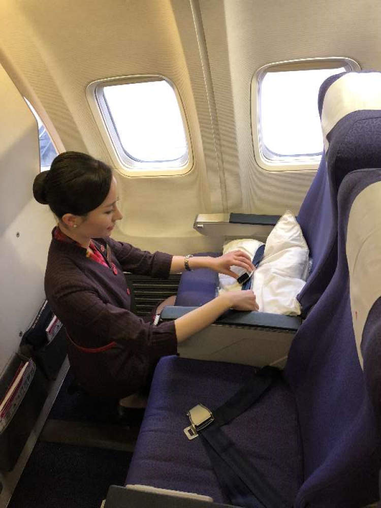 16:05,女孩乘坐升降车来到了机门口,在乘务员的搀扶下入座经济舱第一排,宽敞的空间让女孩能将身体舒展得更开,得到更好的休息。航前,通过IPAD查询得知女孩属羊,乘务员何惠婧用折纸折了一个羊的图案,提前放在她座位上,写“欢迎思蓉宝贝乘机^_^)”。