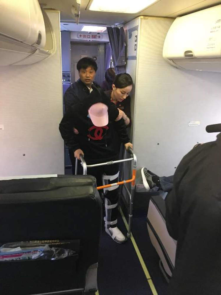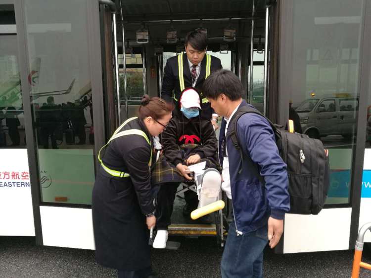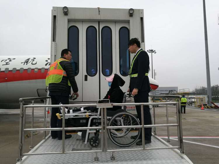 15:30分该航班开始登机,地面人员小心翼翼地推着轮椅,将女孩送上摆渡车,到达远机位停机坪后,又合力通过升降平台车缓缓地护送女孩进入机舱,并随同机组人员将女孩送到第一排的座位上。