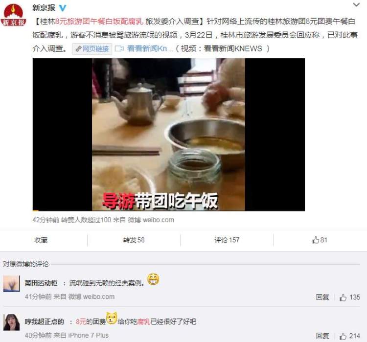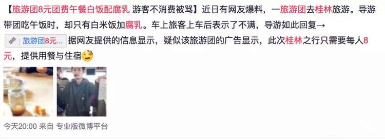 周到君3月21日在微博上看了一个短视频,说的是,在桂林旅游的团友们不满午餐只有白米饭加腐乳。但导游的回复十分强硬,称“这点团费就出来旅游,还不消费不买东西,这是骗吃骗喝骗玩,是旅游流氓。”