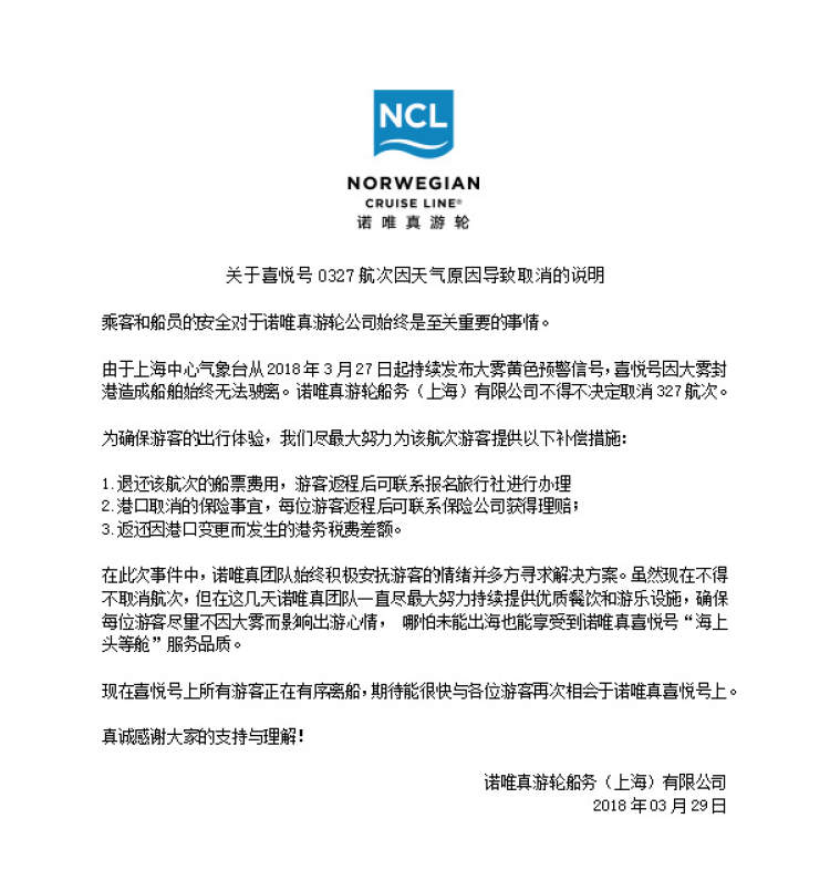 另据,周到君最新了解到。由于受持续大雾影响,造成船舶无法按原计划离港。诺唯真方面已取消了本次行程,并表示会全额退还船票费用。