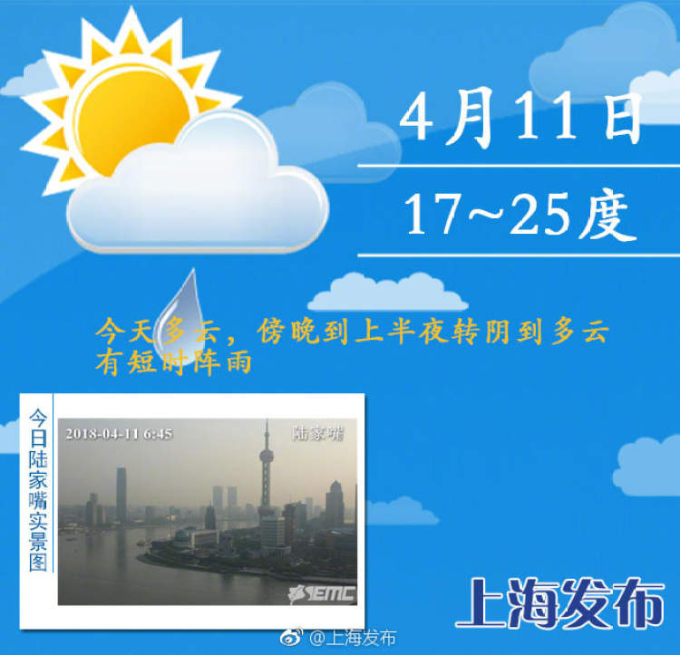 听说降温与下雨很配哦 可惜有北方浮尘来掺和 2018-4-11 最近不仅温度起伏大,晴雨也转换频繁啊~周到君从上海发布获悉,本市今天多云,白天受北方浮尘影响,PM10浓度逐步上升,空气质量良到轻度污染,个别时段中度污染,傍晚到上半夜转阴到多云有短时阵雨,17-25度。明天多云到阴有阵雨,预计周六前本市多降水天气,其中较明显的降雨将出现在明晚到后天白天,大家出行要备好雨具。气温方面,受冷空气影响,明天起本市气温有所下降,最高气温将回落至20度以内。 赞一个 (0)