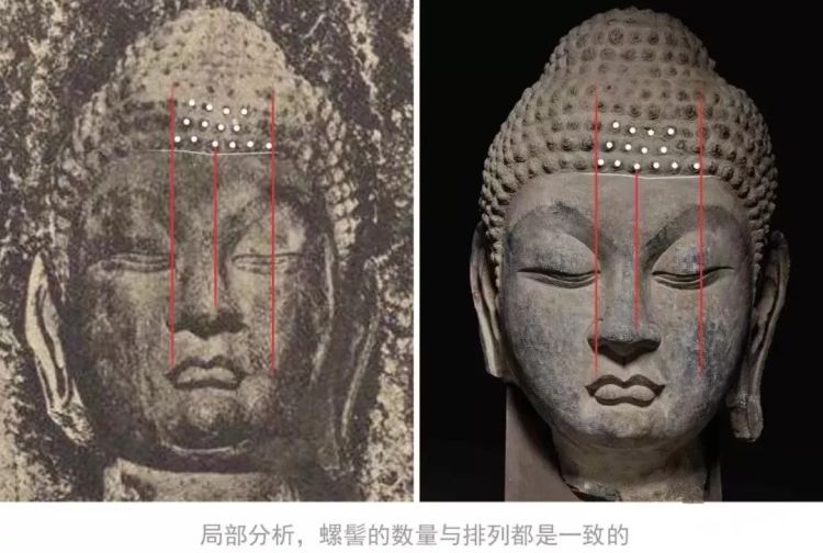 “阳新“用图片进行了反复对比后发现,此次拍卖的佛首石雕头顶上的螺髻数量和排列一致,佛像鼻尖上都有一个白点坑,眉弓处也有几乎相同的黑色结构线。此外,1720窟原有的佛首应该也是70厘米左右的高度,与苏富比发布的佛首尺寸一致,被割走的断口处也能和拍品的断口对应起来。