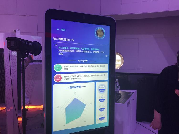 这是一面能够看相的“算命魔镜”,只要站在屏幕前方点击屏幕,它会根据你的五官来算出你今年的运势,并给出一张包括职场、财富、健康、远行和感情等指标在内的雷达运势图。
