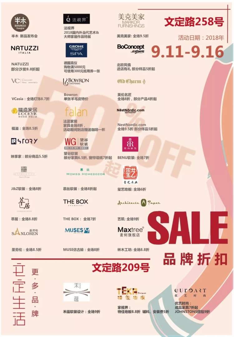 北欧风情部分样品5折起、Natuzzi沙发8.8折起、英伦名匠部分产品4折起、玺艺地板全场6折、美克美家全场9.5折、德国高仪购物满5000元可使用300元抵用券一张。