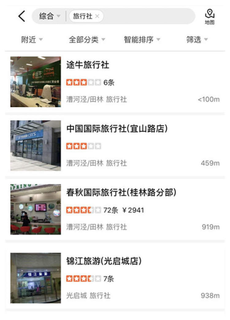 通过某点评搜索,小编分别选择了如下四家旅行社。分别为:途牛、国旅、春秋以及锦江。