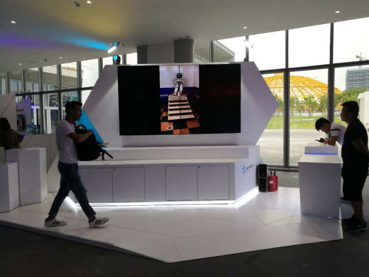 在靠近中心区域的一个展台前,一款相当迷你的娱乐机器人,正通过屏幕展示它那柔软的身体和灵活的动作。记者在探营当天看到,屏幕前已经搭起了一个小小的舞台,据工作人员透露,有20多个机器人已经“藏”在舞台下准备就绪,就等着展区开放后向大众一展风采。