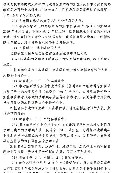 (四)报名参加法律(非法学)、法律(法学)、工商管理、公共管理、工程管理、工程硕士中的项目管理以外的其他专业学位硕士研究生招生考试的人员,须符合第Ⅰ条中的各项要求。