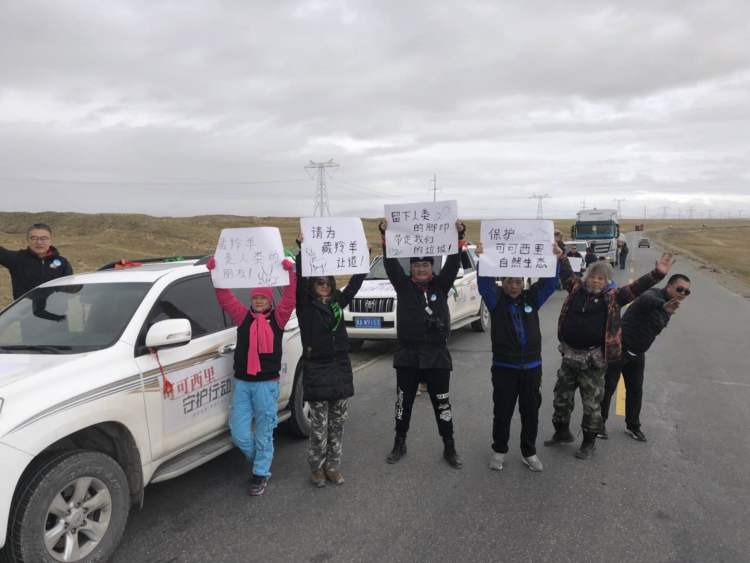 在赶往下一个保护站坨坨河时,前方道路上有几只藏羚羊正要“过马路”,队员们见状后赶紧写了“请为藏羚羊让道”、“可可西里扎西德勒”的标语高高举起,告知后方来车稍等片刻,为可爱的藏羚羊让出一条通道。