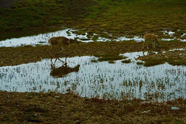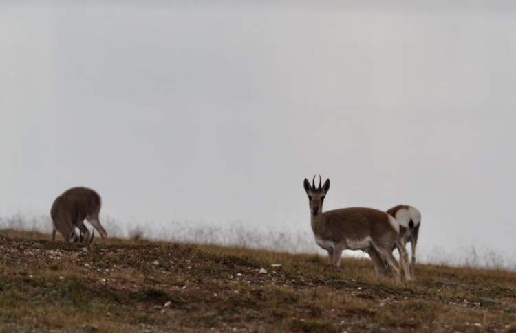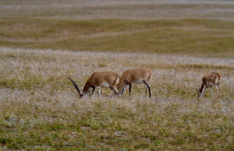 约在两百米左右的沼泽草地上有两只藏羚羊在低头食草,毛色几乎与棕色的短草融为一体,一眼望去很难被发现。从500mm的长焦镜头拉近拍摄,可以清晰地看到这是三只长有细尖长角的公藏羚羊!