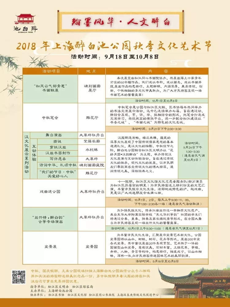 墨韵馨香醉金秋,文化赋诗筑传承。上海醉白池公园作为“中国历史名园”之一,九百多年的历史变迁积淀了深厚的文化底蕴,“弘扬中华传统文化,提升古典园林品牌,助力人文松江建设”是公园举办秋季文化艺术节之目的所在。本次以“翰墨风华?人文醉白”为主题的艺术节,汇集“松风云气郁青葱”书画联展、中秋笔会、汉文化展示系列活动、戏曲进公园、“丝竹情·醉白韵”古筝专场演出、盆景展等六大主题,届时将以静态观摩、动态展演、线上线下互动等形式于一体,将中华优秀传统文化及醉白池深厚的历史底蕴集中展现给游客,并通过提升景区游览品质,增强市民游客旅游体验,丰富旅游节期间市民精神文化生活,着力推进全域旅游大发展。