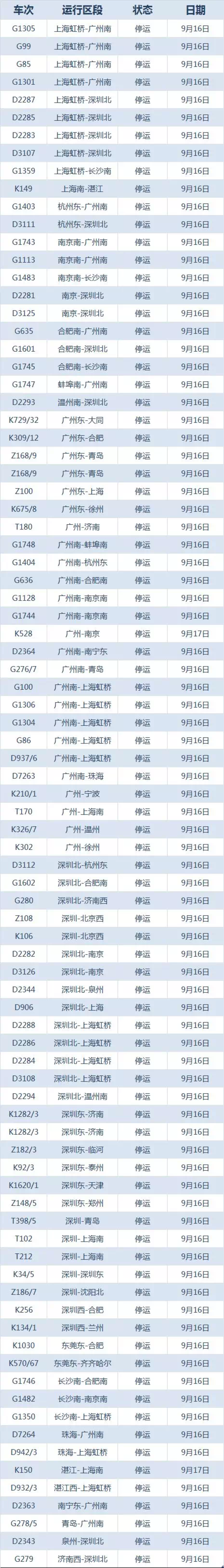 因受台风“山竹”影响,2018年9月16-17日部分旅客列车停运,具体车次如下: