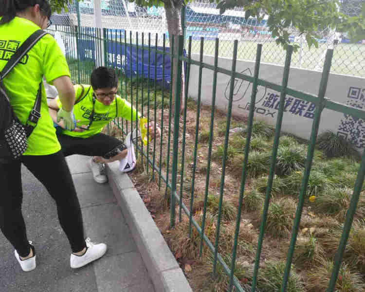 杨女士所在的跑团,需要从鲁迅公园跑至凉城公园再折返回出发点,总路程约为8公里。在路过虹口足球场时,杨女士发现一些薯片袋和矿泉水瓶散落在设置了栏杆的草坪内,即使她伸长手臂也够不着。跑团成员见状纷纷停下,合力将草坪内的垃圾清理出去。