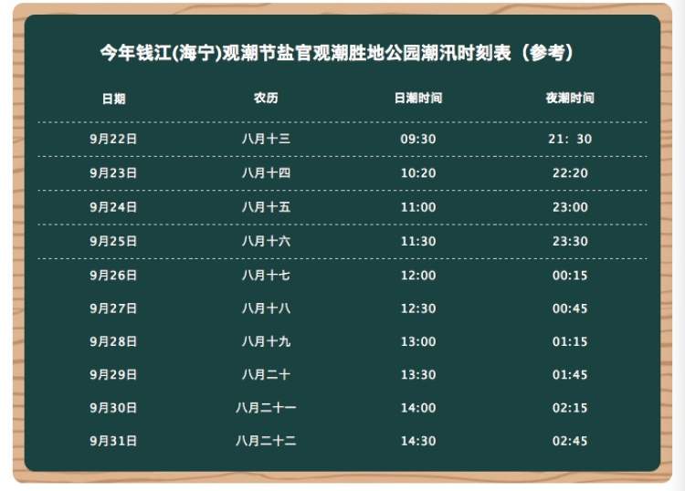 本周,第二十五届钱江(海宁)观潮节推介会在沪举行。周到君从会上了解到,今年钱江(海宁)观潮节将于9月22日至10月1日(农历八月十三至八月廿二)在海宁举行,正好处在中秋、国庆假日期间。