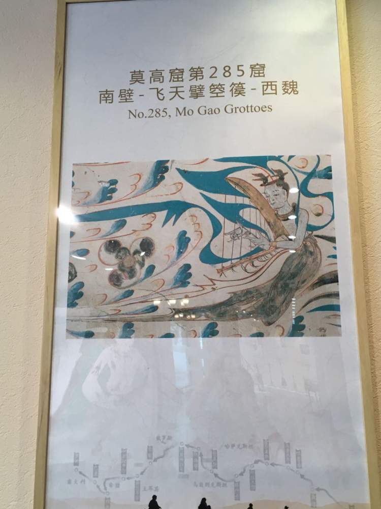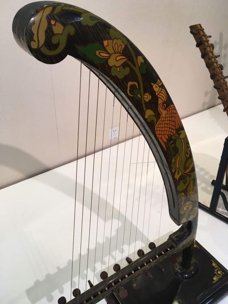 ▲唐代诗人李贺写过名诗《李凭箜篌引》,莫高窟里也常见“飞天擘箜篌”的壁画,箜篌这种古老乐器早已失传,此次展览上,观众可以看到箜篌的复制品,样子是如此精美。