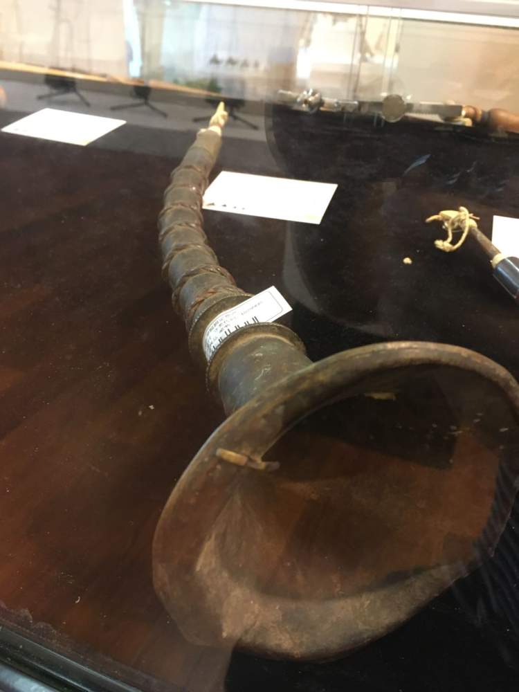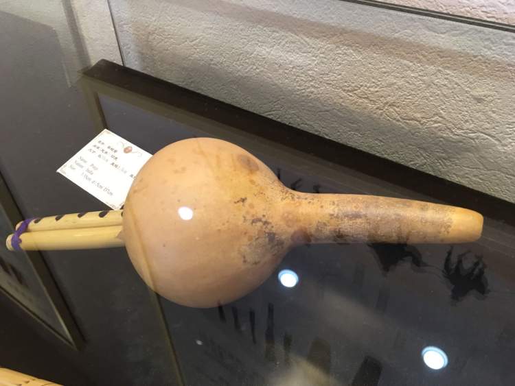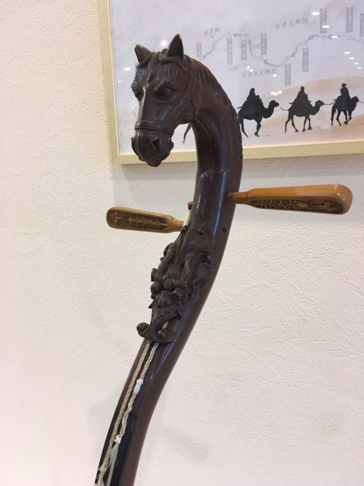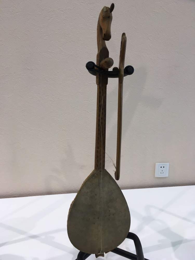 ▲来自前南斯拉夫的古老乐器古兹拉已经非常罕见了,它的身上雕刻有马头,同中国蒙古族的著名乐器马头琴放在一起展示,说明东西方文化内在相通性。