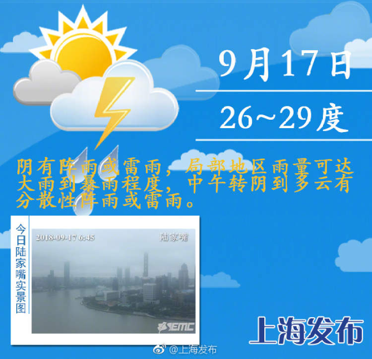 经历了双休日的闷热 今早的雨是不是特别清凉 2018-9-17 小伙伴们今天要记得带伞啊!今天阴有阵雨或雷雨,局部地区雨量可达大雨到暴雨程度,中午转阴到多云有分散性阵雨或雷雨,26-29度。明天多云到阴有分散性阵雨, 预计本周前期,本市处于副高边缘,气温再次回到30度之上,以多云或阴到多云天气为主,但仍需注意局地有阵雨或雷雨,本周后期气温将有较明显回落。 来源:周到上海 作者:周到君 赞一个 (0)