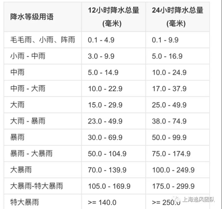 累计雨量如何对应降水等级,可以参考这张图↓ 也就是说,崇明区达到了大暴雨级别,而崇明局部地区达到了特大暴雨的级别。