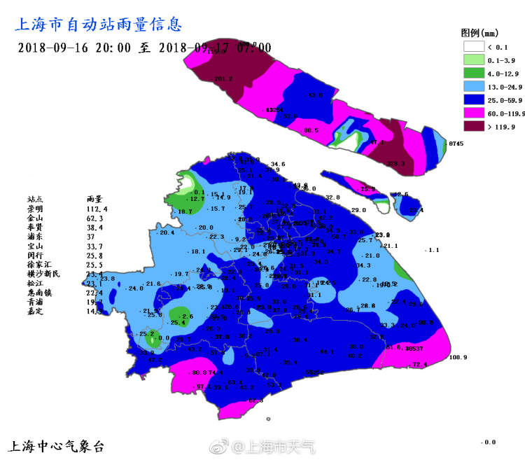 上海中心气象台发布, 受台风“山竹”倒槽和北方弱冷空气的共同影响,昨天20时到今天07时本市大部地区出现强对流天气,其中崇明站112.4毫米,自动站中崇明庙镇生态园328.3毫米为最大,最大小时雨强出现在崇明明珠湖131.2毫米(16日20时-21时)。