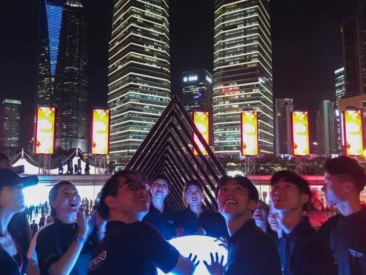 活动现场有260个直径50厘米的球形灯、30个边长3.6米的三角形灯,灯阵面积约400平方米。每场12名幸运市民,由主持人引导依次经过欢乐反应堆、欢乐推进器到达欢乐发射器。反应堆跟随单音演奏的变化,每一个音符,犹如彩色的水滴般在分区的装置中晕染开来;当节奏变快、音色丰富时,反应堆装置的图形变化也会变得纷繁复杂;随着震荡波般的色块脉冲,经由台阶推进装置,直至上层发射装置,与塔身影像色彩产生联动。最后在这场魔法阵般的音乐光影演绎中,东方明珠塔由参与市民们亲手点亮,现场变身一片绚丽多彩的海洋!
