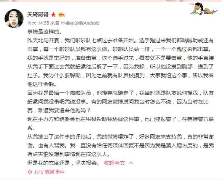 “因为我是最后一个啦啦队员,他摸完就跑走了,我当时就跟队友说他摸我,队友赶紧问我没事吧,我说没事……”