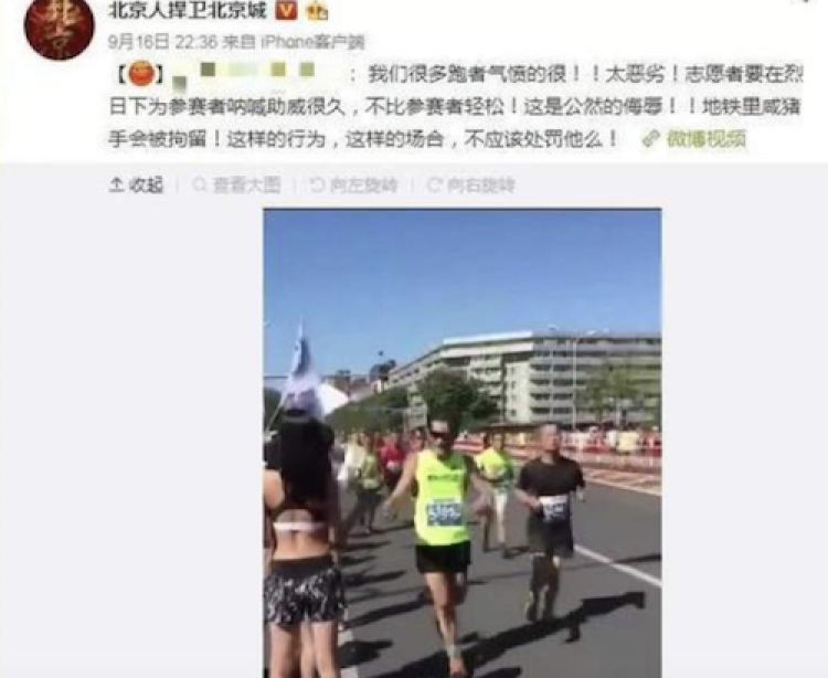 2018北京国际马拉松落下帷幕,有网友赛后发布了一段视频,显示一名参赛者对途中的女啦啦队员作出袭胸动作,引发了跑友圈的广泛关注。