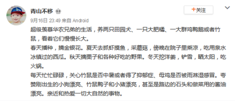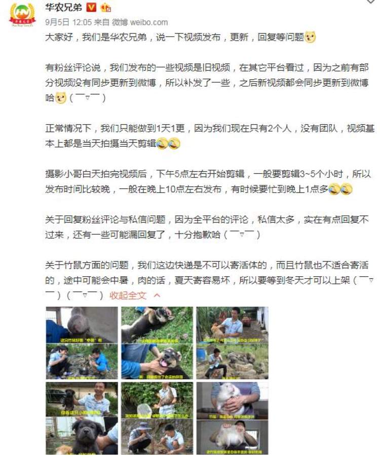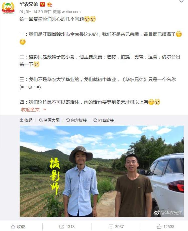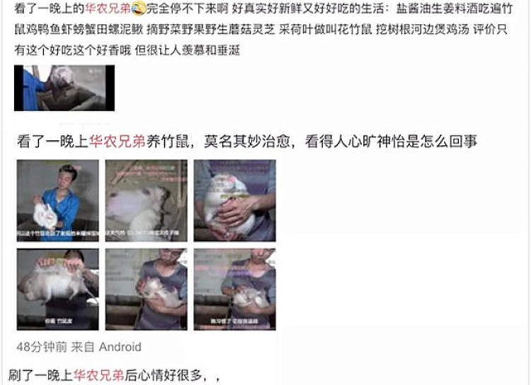 在新京报的采访中,华农兄弟表示“我们是养竹鼠的,养着养着不知道怎么回事就变成美食博主……”