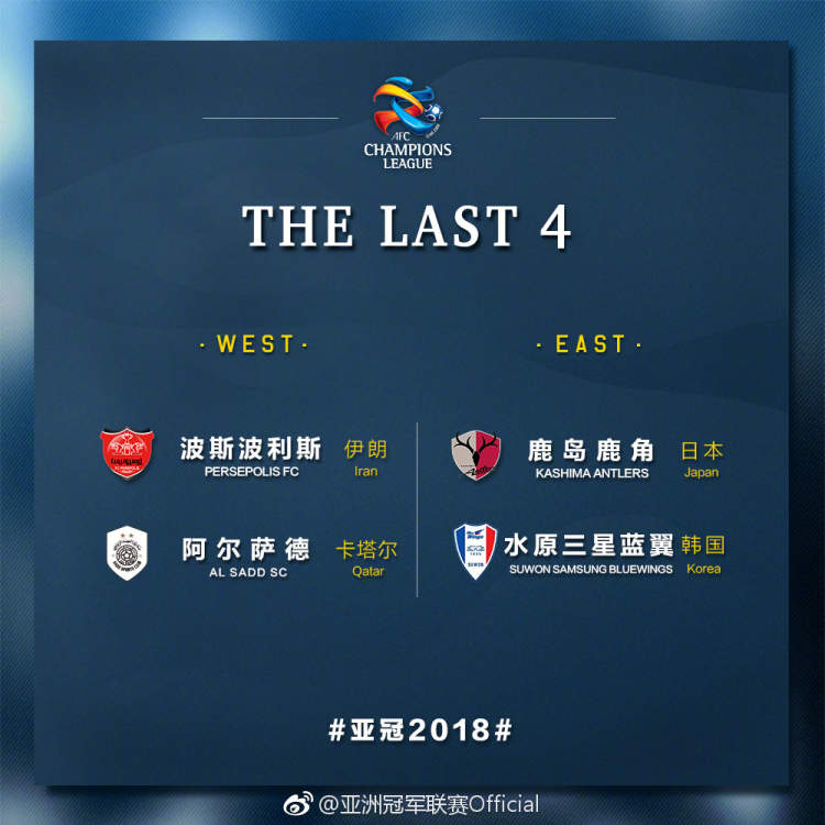 前一天,鹿岛鹿角3比0战胜天津权健,总比分5比0晋级。这样,本年度亚冠四强名单全部产生。西亚区将由伊朗球队波斯波利斯对阵卡塔尔球队阿尔萨德,东亚区日本鹿岛鹿角对阵韩国水原三星。值得一提的是,两组半决赛对阵球队在小组赛就分在一组,当时波斯波利斯和阿尔萨德分别在主场战胜对手,鹿岛鹿角和水原三星则分别在客场战胜对手,两队所在的H组还有上海申花。