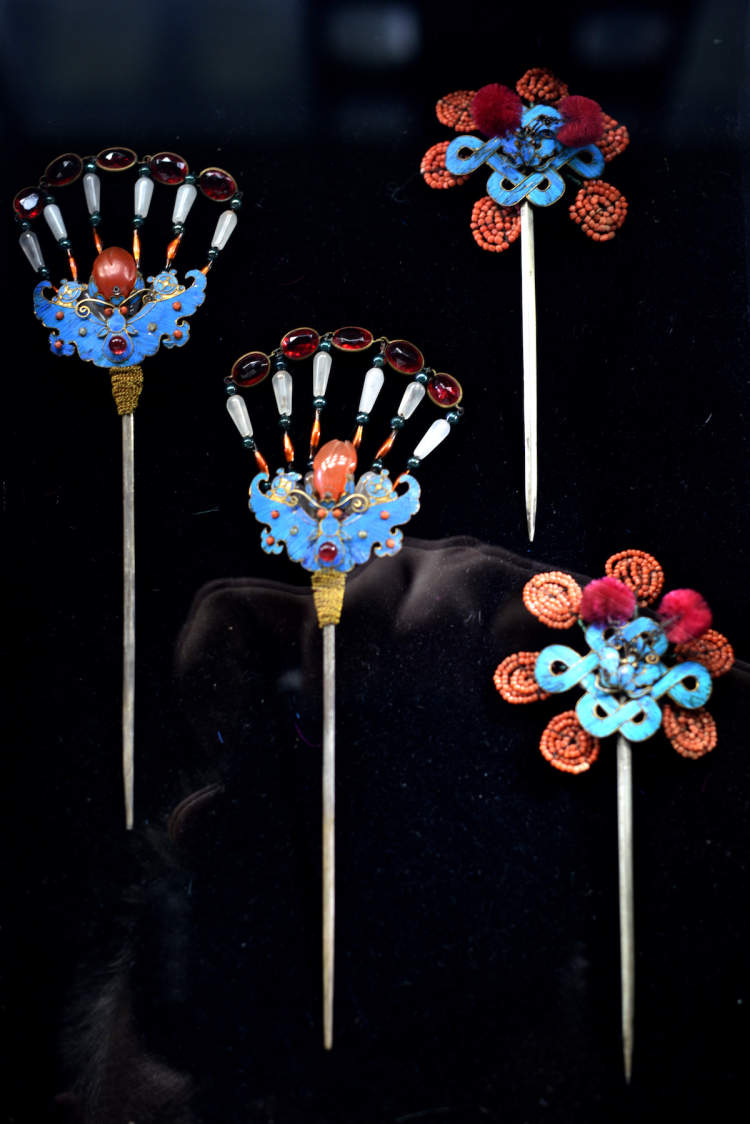 石韵馆内,展示的是中国古老的首饰作品点翠工艺,由金属工艺和羽毛相结合,精致无比。清代时期点翠工艺达到了顶峰,更是成为皇宫内的标配之一。此次展出42件珍品,包括点翠项链、点翠亭台楼阁纹饰项链、双鱼点翠鎏金蜜蜡铜珠项链、点翠绒布眉勒等,最引人注目的要属价值连城的道光时期9凤双龙凤冠。