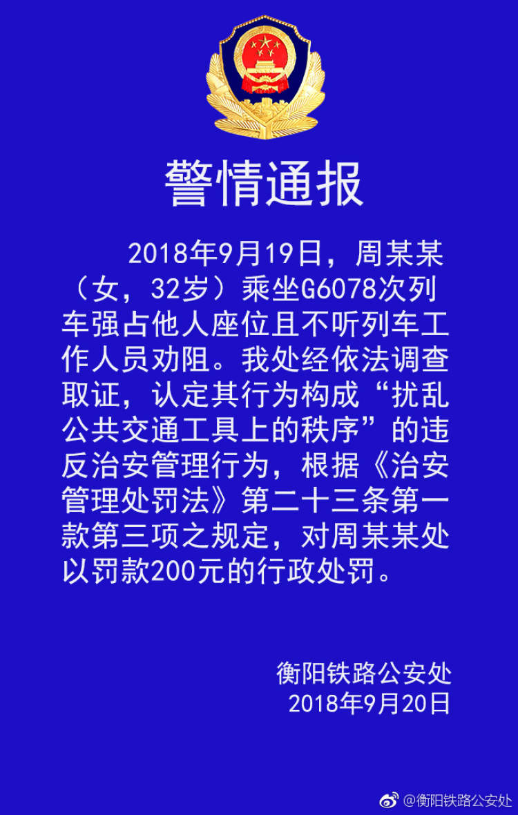 就在今天,广州铁路公安局衡阳公安处官方微博@衡阳铁路公安处 9月20日发布警情通报:2018年9月19日,周某某(女,32岁)乘坐G6078次列车强占他人座位且不听列车工作人员劝阻。我处经依法调查取证,认定其行为构成“扰乱公共交通工具上的秩序”的违反治安管理行为,根据《治安管理处罚法》第二十三条第一款第三项之规定,对周某某处以罚款200元的行政处罚。