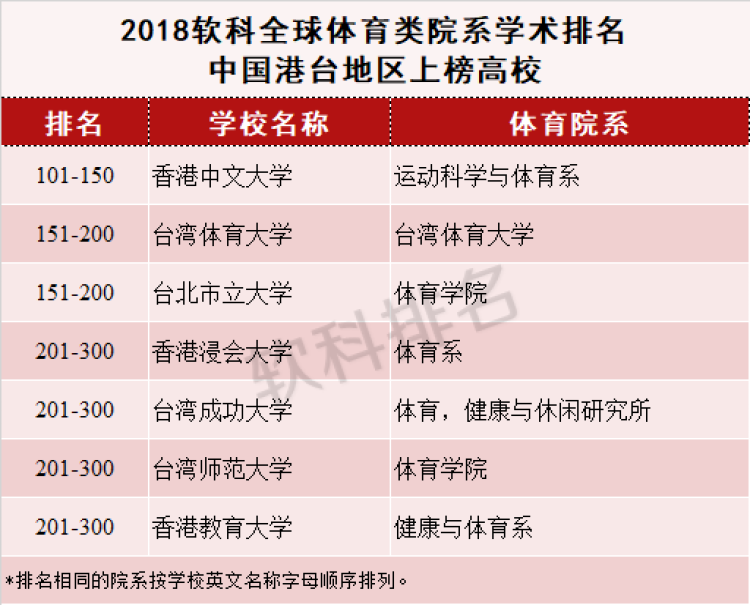 软科今天发布2018年全球体育类院系学术排名,我国内地共有6所高校上榜,上海体育学院位列全球百强,再次成为国内世界排名最高的体育类院系。