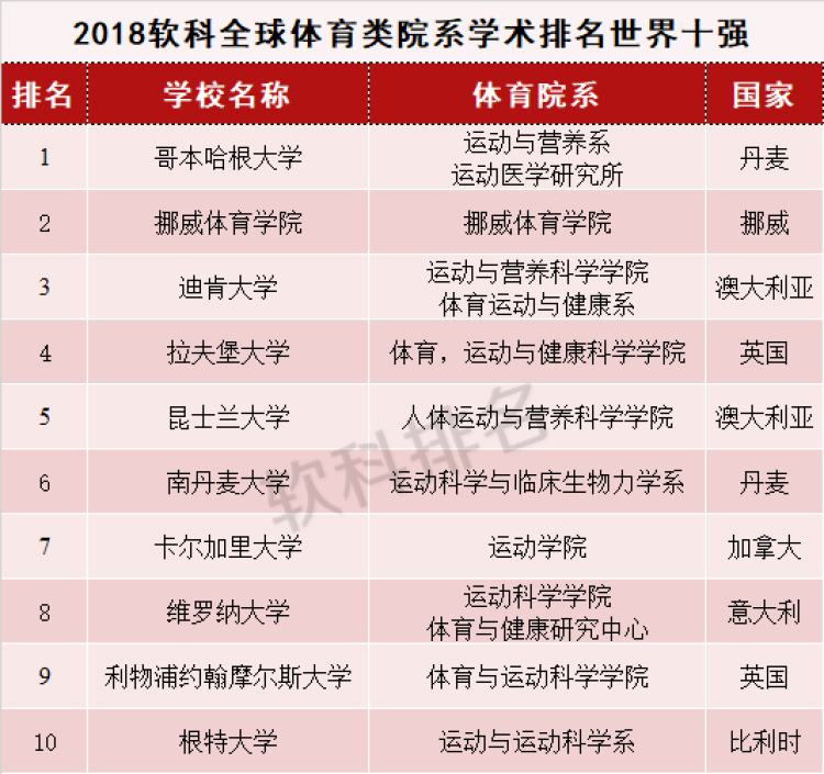 全球十强高校中,综合性大学的体育院系占据主导地位,专门类体育院校仅有排在第2名的挪威体育学院。丹麦、澳大利亚、英国的体育类院系在排名中表现出色,它们在世界前十名中各占据两席。
