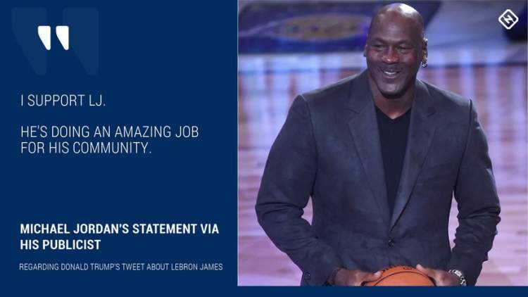 乔丹托人发声明说:“我支持LJ(勒布朗-詹姆斯),他为社区做的事非常了不起。”