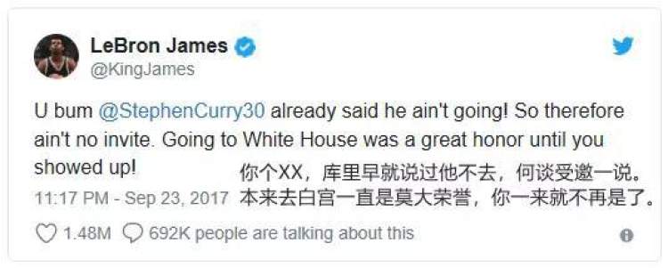 除了讽刺特朗普,詹姆斯还对特朗普撤回邀请NBA总冠军勇士队访问白宫一事大发不满。詹姆斯讽刺说:“本来去白宫是莫大荣誉,你一来就不再是了。”