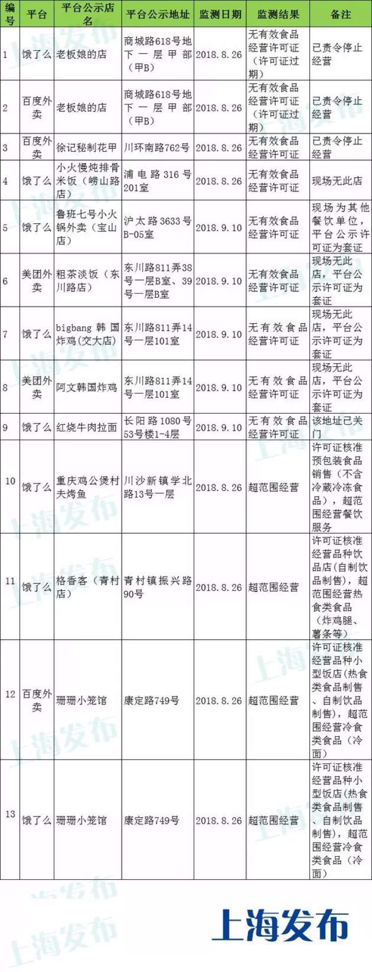饿了么平台的珊珊小笼馆、百度外卖平台的徐记秘制花甲等13户次存在问题,涉及无有效《食品经营许可证》或《便民饮食临时备案公示卡》、严重超范围经营等行为。