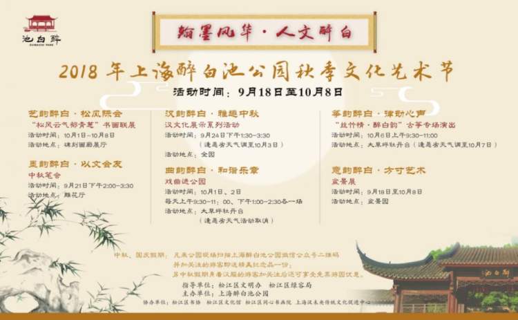简介:本次以“翰墨风华•人文醉白”为主题的艺术节,汇集“松风云气郁青葱”书画联展、中秋笔会、汉文化展示系列活动、戏曲进公园、“丝竹情·醉白韵”古筝专场演出、盆景展等六大主题,届时将以静态观摩、动态展演、线上线下互动等形式于一体,将中华优秀传统文化及醉白池深厚的历史底蕴集中展现给游客。