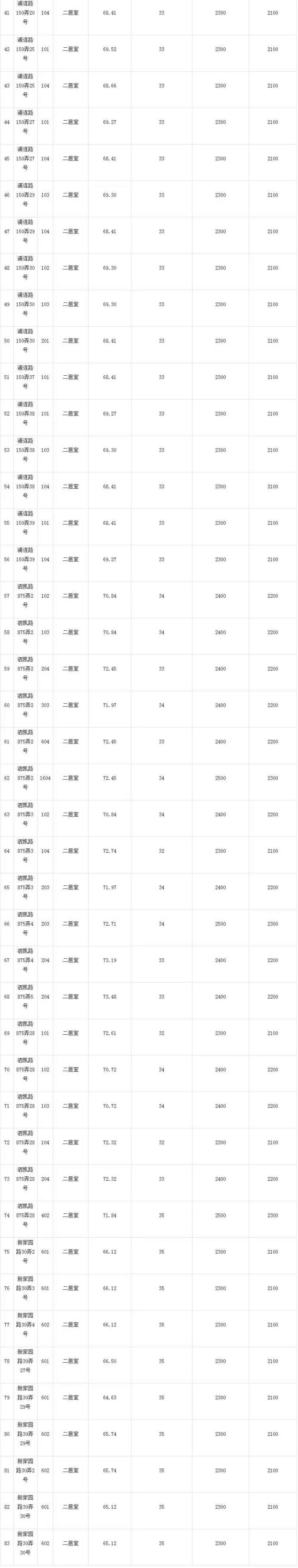 项目皆为两居室,建筑面积从65.12㎡到73.48㎡不等,折后价分为1400/1500/2100/2200/2300(元/套/月)五种。