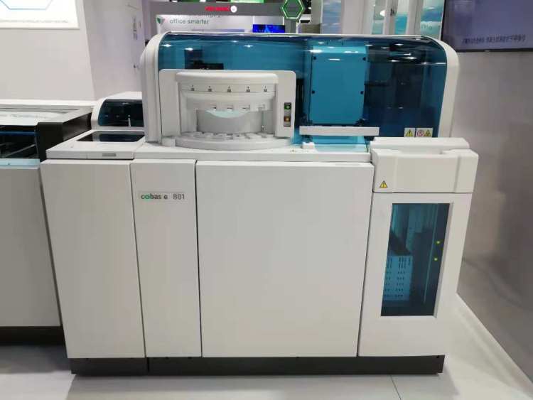 罗氏诊断这次也带来了一系列最先进的展品。比如这台“cobas e 801全自动化学发光免疫分析仪”,不仅可以一管血检测超过90种项目,而且每台机器每小时能处理300个样本,4台机器联动处理量可达1200个样本,速度堪称全球最快。