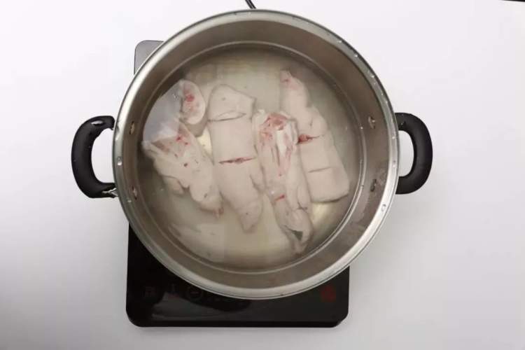 1.水烧开,下猪蹄,三分钟左右待浮沫析出后过冷水洗净备用