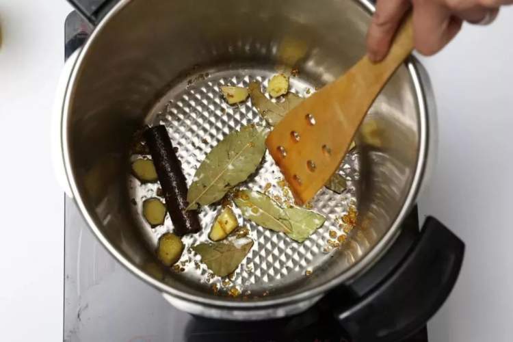2.炒锅中放少许油,7成热后下姜片、桂皮、香叶、干桂花,爆香后放入猪蹄,炒至焦黄
