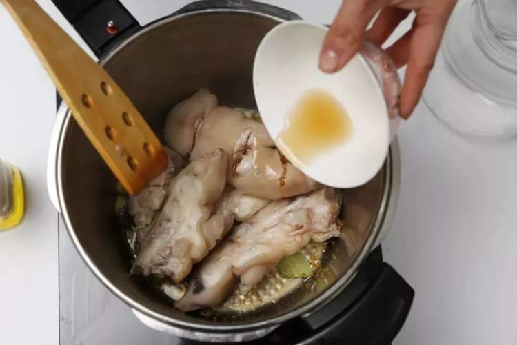 3.倒入约100毫升红烧酱油、料酒,加入没过猪蹄的清水,大火烧开