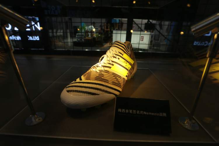 服贸馆内离国米不远的一处展台属于阿迪。阿迪更是将中国元素贯彻到底,除了有梅西亲笔签名的战靴外,还有53码、红白相间的姚明的球员专属战靴。
