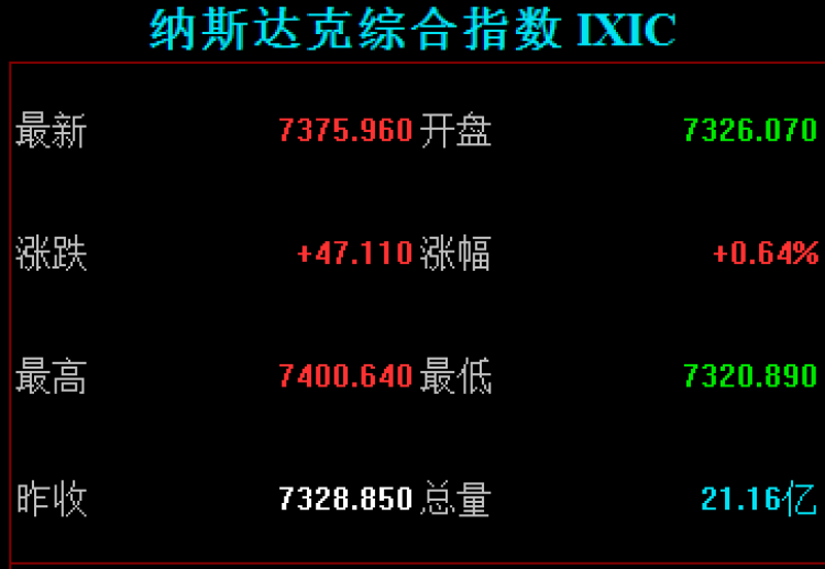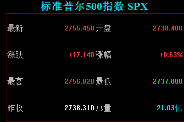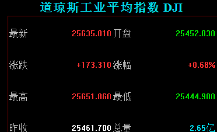 道琼斯工业平均指数收盘涨173.31点,涨幅0.68%,收报25635.01点;标普500指数收盘涨17.14点,涨幅0.63%,收报2755.45点;纳斯达克综合指数收盘涨47.11点,涨幅0.64%,收报7375.96点。