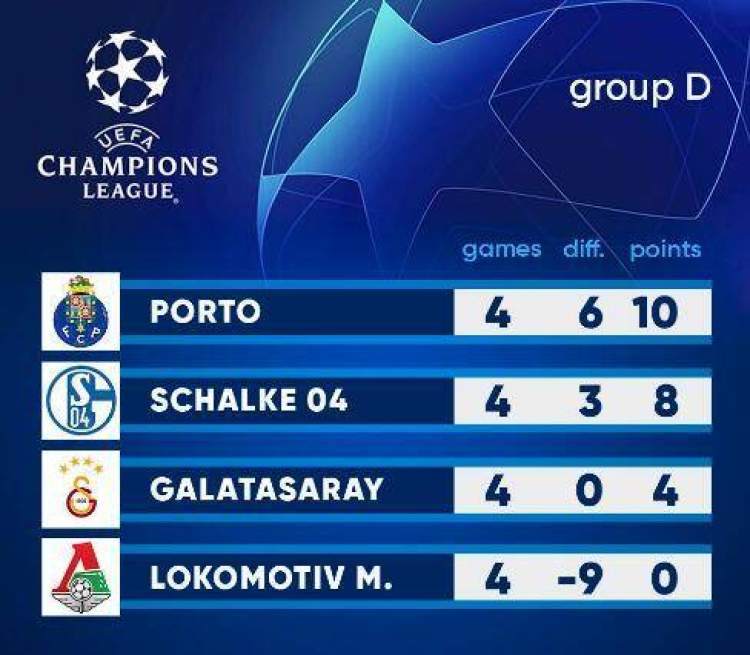 另一场比赛,沙尔克主场2比0战胜加拉塔萨雷。波尔图10分出线在望,火车头4场全败提前出局。