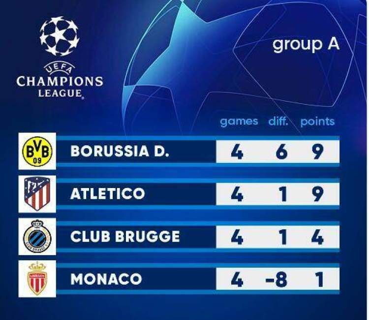 前4轮过后多特与马竞同积9分,两队携手出线形势大好。