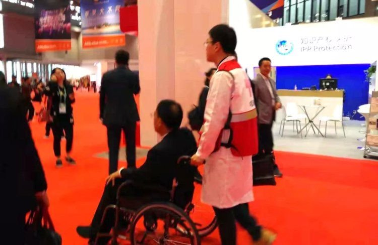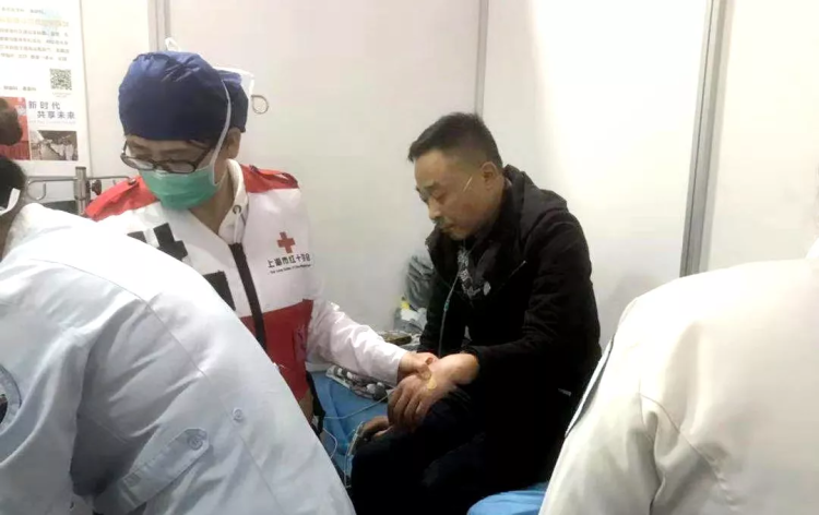 来自上海市红十字第九人民医院的巡视志愿者朱智军,在巡视到4.1馆4号门时,接到工作人员求助,一位日本展方工作人员扭伤后腰部疼痛,活动严重受限。