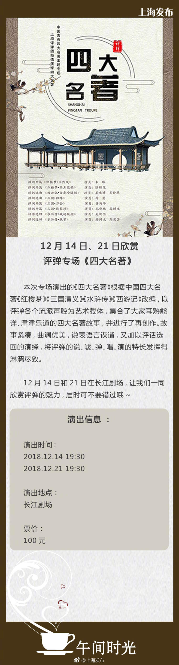 用一场评弹的时间,听完《四大名著》的故事 2018-11-07 你喜欢听评弹吗? 专场演出的《四大名著》根据中国古典四大名著改编,以评弹各个流派声腔为艺术载体,集合了大家耳熟能详、津津乐道的四大名著故事,并进行了再创作。故事紧凑,曲调优美,语言诙谐,又加以评话选回的演绎,将评弹的说、噱、弹、唱、演的特长发挥得淋漓尽致。 12月14日和21日在长江剧场,一同来欣赏评弹的魅力吧~ 来源:周到上海 作者:周到君 赞一个 (0)