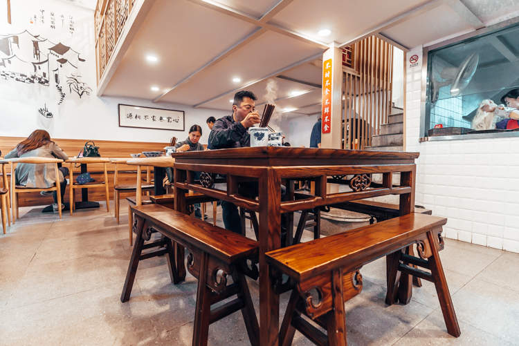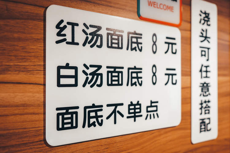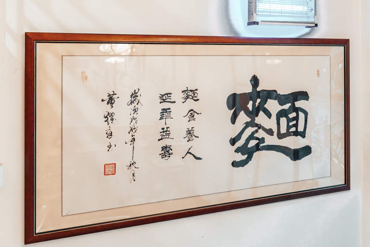 在装修上,小汤尽可能还原苏州“裕興记”的样貌。一走进店内,两张古色古香的八仙桌便映入眼帘,白色的墙上挂着一副“麵“字的书法作品,可见主人对于面的偏爱之情。